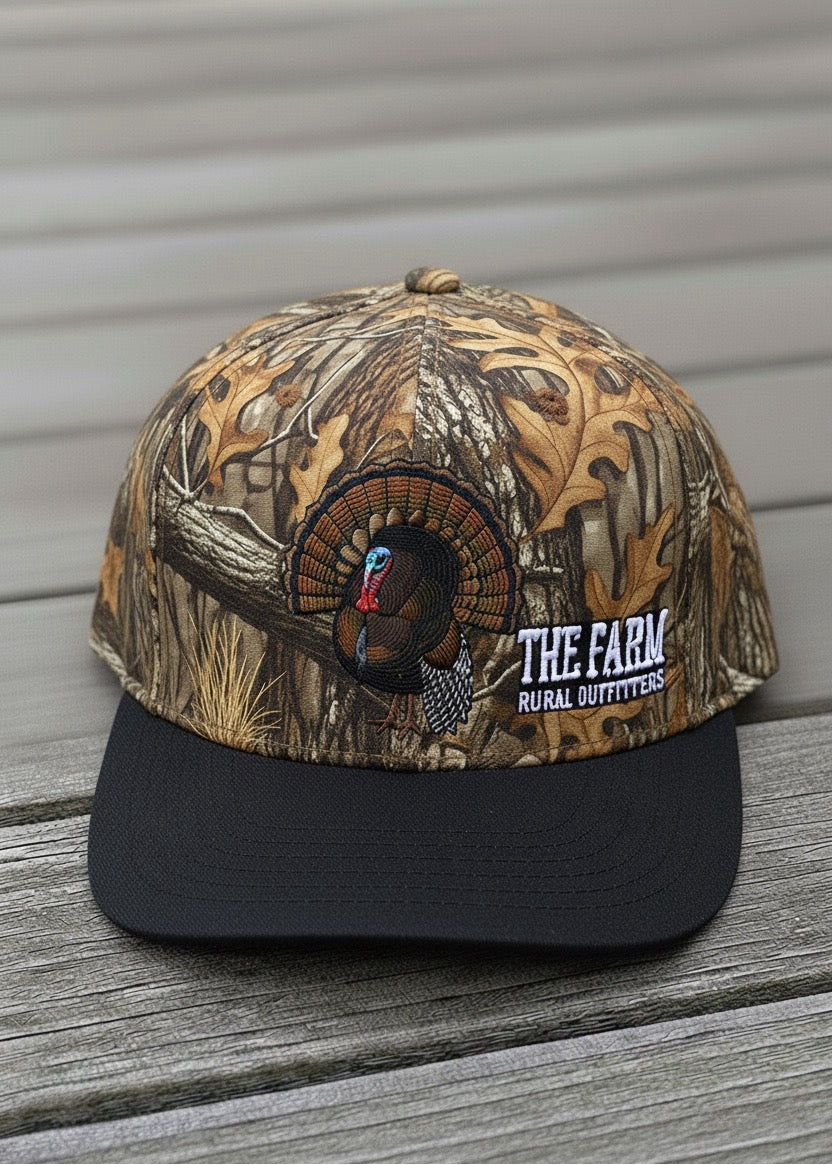 Built for the woods and made for the hunt, the “Gobbler” Turkey Camo Cap from The Farm Rural Outfitters brings the spirit of spring mornings and hardwood ridges to life.